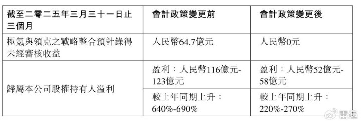 吉利汽车(股票代码:00175.HK)今日发布2025年第一季度的业绩预告,会计政策变更前:预计归属公司股权持有人溢利为116亿至123亿元,较上年同期增长640%到690%。